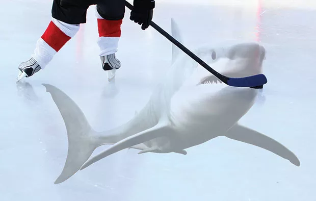 Philadelphia Flyers vs. Washington Capitals on thin ice over a shark tank.