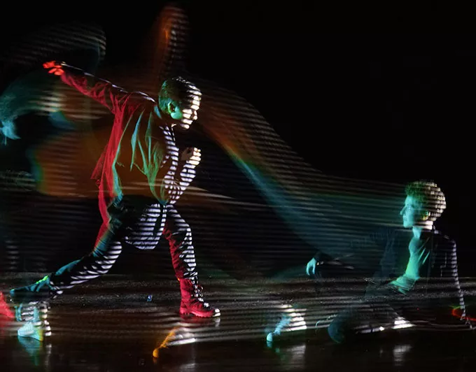 Porter started developing NOW:PLAYING in 2013 by using two projectors on each side of the stage to provide what she calls a “playground” for the dancers. The idea, she says, differs from conventional uses of theatrical projection and lighting, as images are usually cast on the back wall of a stage.