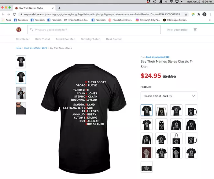 As of press time, at least one TeeChip seller, Naptural Store, is still selling Omololu’s knockoff acrostic shirt featuring the names of Black men and women killed in police custody on its site for $24.95.