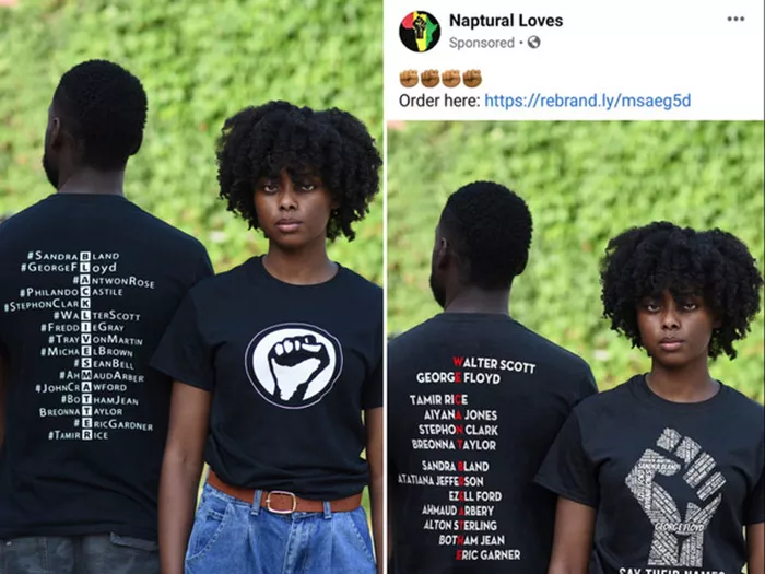 On the sponsored post was Bader’s photograph, with Omololu and Jones posed side-by-side in their T-shirts. In the photo, Omololu posed from behind, showing the back of the shirt displaying the names of Black people killed in police custody, with letters used to spell out an acrostic. But the back of the T-shirt was Photoshopped with a new design: the names now changed slightly from Omololu’s original list — Antwon Rose was not listed, for one, and some names were misspelled — and the “Black Lives Matter” acrostic had been changed to “We Can’t Breathe.” The simplistic black-and-white fist design on the front of the original shirt Jones was modeling, now Photoshopped with a new redesigned much larger fist.