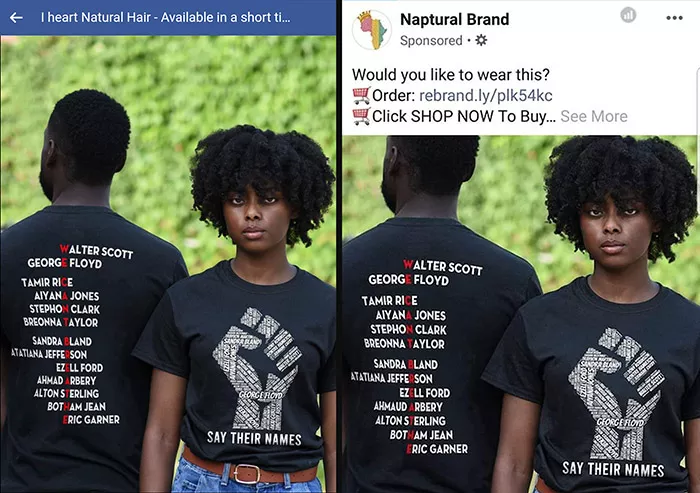 It didn’t stop with just one page, either. The photograph and copycat design also started showing up for sale on additional Facebook pages, sponsored Facebook posts, and websites, including but not limited to Naptural Loves, Peace Love America, and Black Girls Are Beautiful.