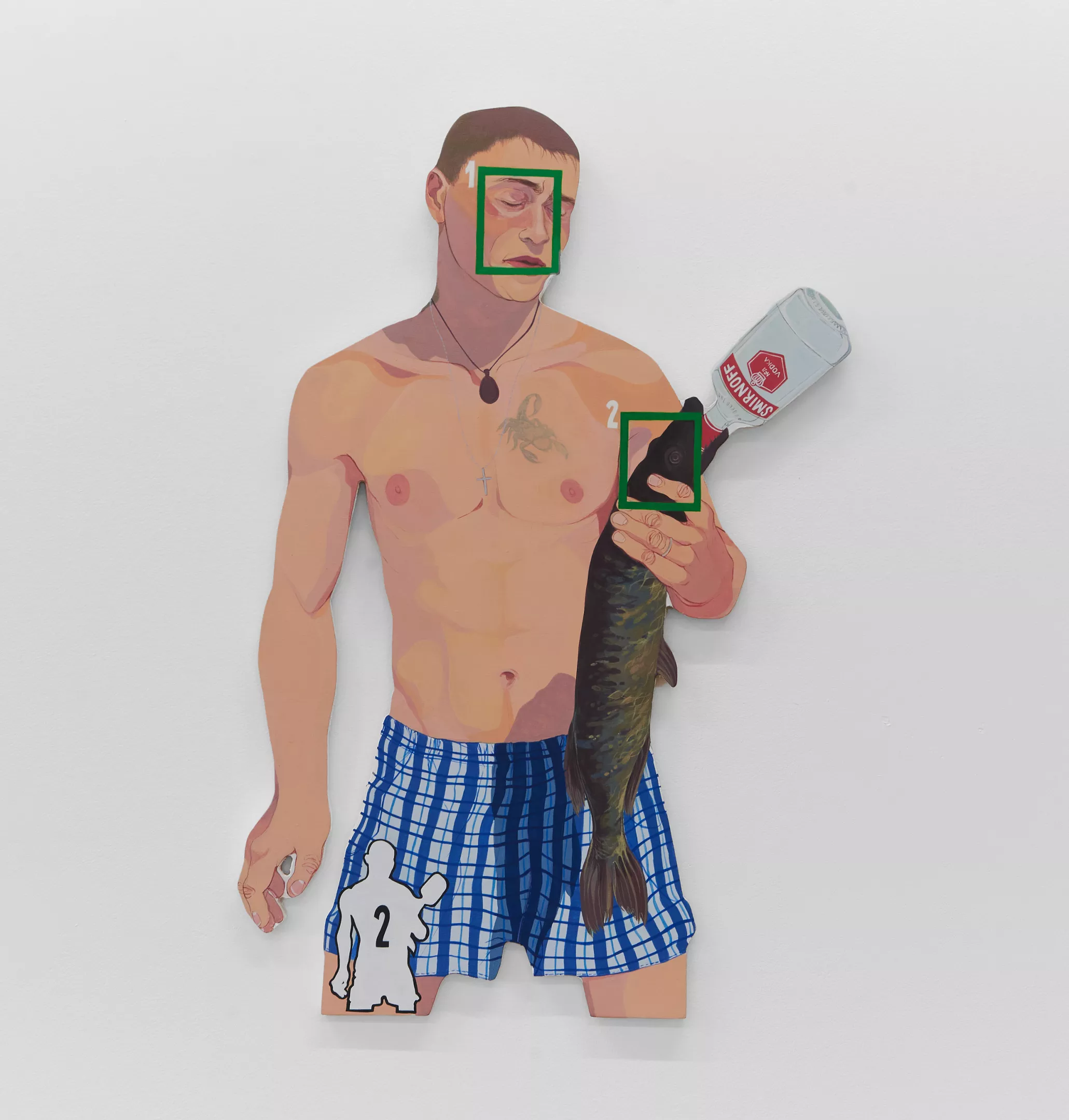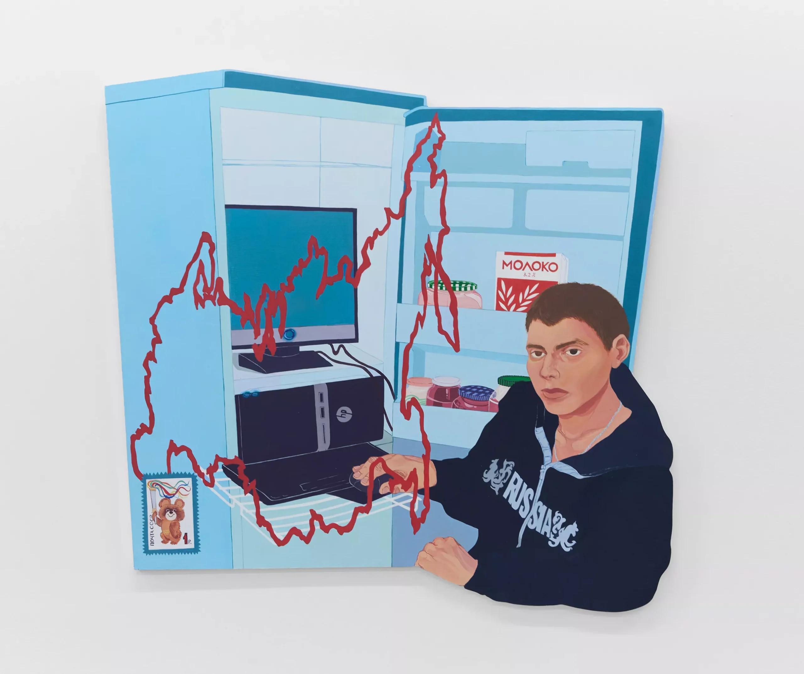 Petukhova explores how post-Soviet people are defined within the digital space, adding that she encountered thousands of videos and memes labeled as depicting Russian life. She incorporated one image from Facebook showing a young, shirtless fisherman holding a carp with a bottle of vodka shoved in its mouth. “Burgeoning Blue Screen,” one of the six new works on display, came from a meme of a young Russian man proudly showing off his desktop computer set up in, of all places, a refrigerator.