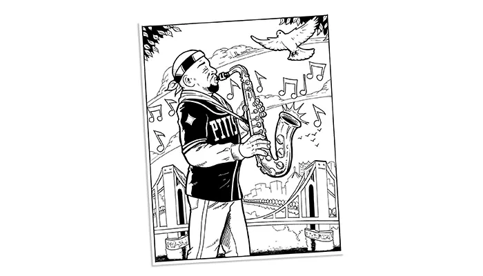 When I draw real subjects — or fictional subjects based on real people, places, or things — I always amass reference images first. That meant gathering images for the sax player, his instrument, Pittsburgh bridges, the skyline, birds … everything in the drawing had to look believable. I use a digital tablet to scroll through the images while I draw in pencil, which is way easier than the old way of having physical references strewn everywhere! I typically get pencil artwork approved from a client before moving on to inking (a.k.a. finishing) it. At that point, I erase remaining pencils and scan the piece for coloring. I use the same photos for color reference.