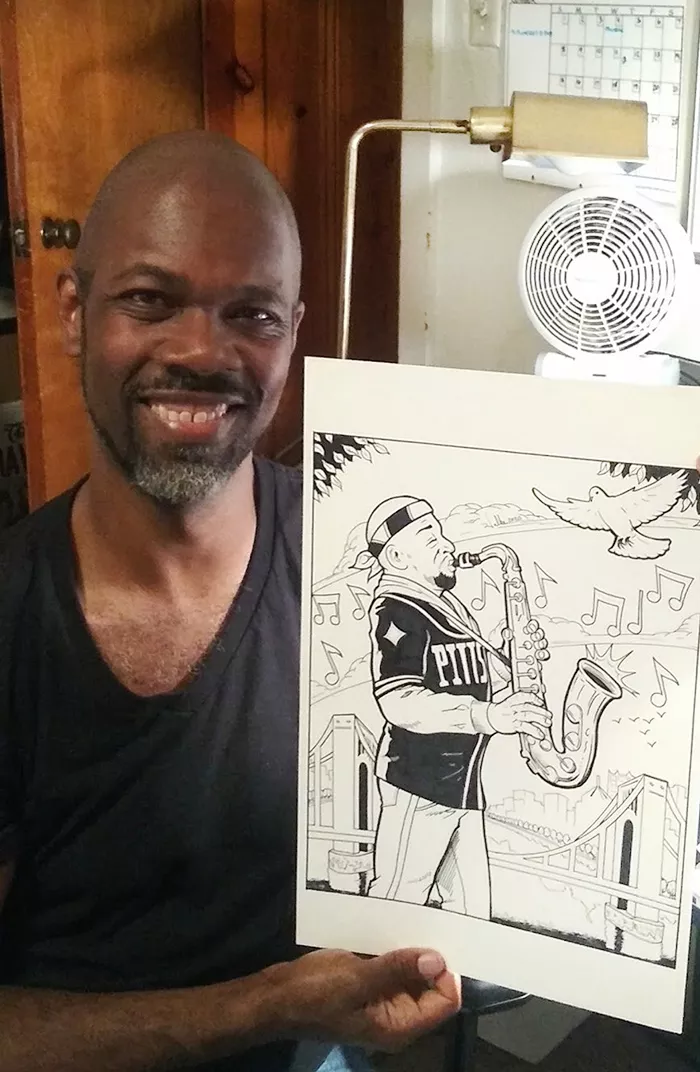 Pittsburgh artist Marcel Walker jumped at the chance to illustrate the Pittsburgh legend. “I LOVE this guy!” he exclaimed when signing up for the project, and says he listened to a lot of jazz saxophone while he was drawing the piece.