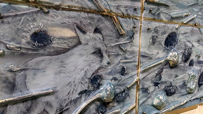Drawing viewers into the show’s thoughtful themes and statements are works defined by spectacular technique. It’s impossible to deny, even at the risk of coming off as shallow, how much beauty the gallery contains, much of which has its roots in nature. “Home Range” by Sibylle Peretti, for example, depicts photorealistic foxes against a blue-tinted multi-media collage. Welsh artist Verity Pulford wows with “Study of Lichen,” a trio of jarringly gorgeous pieces splashed with rich yellow and fanned out in delicate, organically inspired structures.