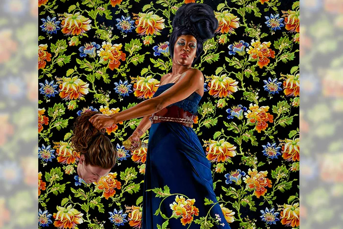 Unlike Gentileschi’s painting, Wiley’s “Judith Slaying Holofernes,” which was painted in 2012, shows a Black woman in a flowing gown grasping the severed head of Holofernes, all of which is set against one of the painter’s signature floral backgrounds.