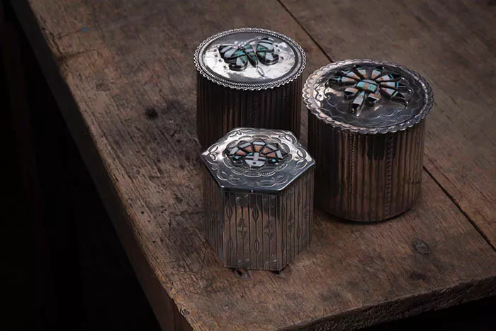 Sanders, now creative director at Four Winds Gallery, garnered images of silver boxes from the collection of shop owner John Krena, who first took interest in Native American jewelry in the 1970s as a steelworker looking for a way out of the mill. Krena and his wife, Carol, often traveled southwest to camp, where they visited reservations, bought jewelry, and brought it back to customers in Pittsburgh.