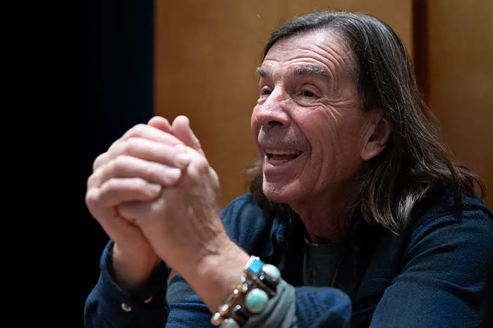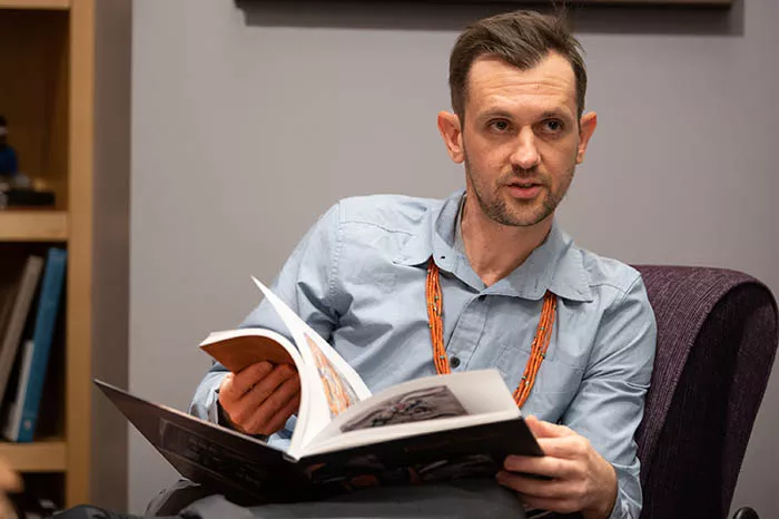 “Wait,” says Sanders, quickly flipping the Elegant Vessels’ glossy pages. He pauses on a page to thump a finger onto a corner, ironically, with no photo. Instead, there’s a text excerpt of a traditional Navajo blessing: “It is finished in beauty.”