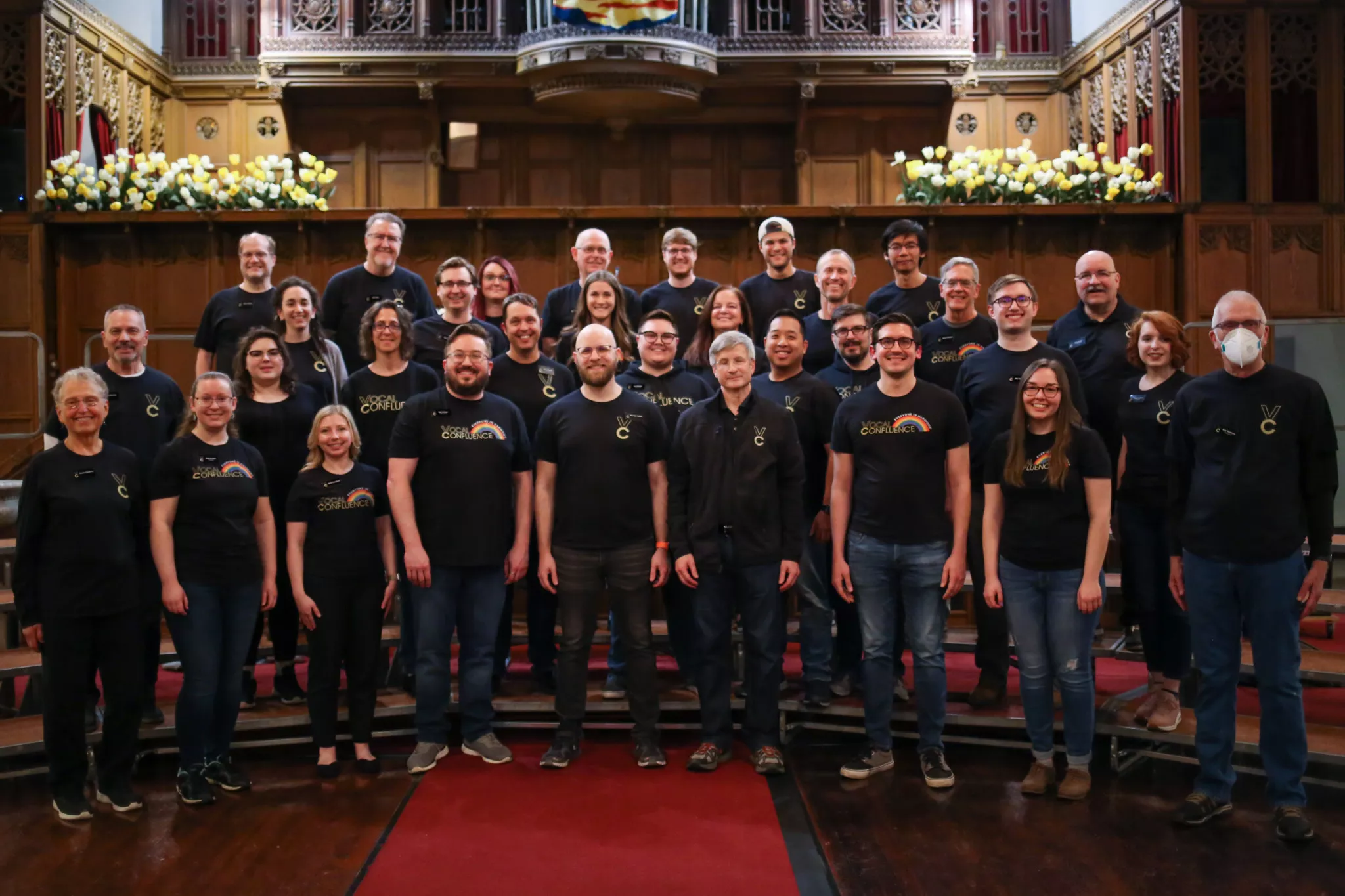 Today’s chorus of 51 singers skews noticeably younger than others in the region. Membership ranges from 21 to 75 years old, with Rauch putting the average age at 38. From the church pews, I spot singers (not in full show dress for rehearsal) wearing Pitt, Donald Duck, and Jimi Hendrix t-shirts, in addition to some of Vocal Confluence’s own merch, which features the traditional barber’s pole with rainbow stripes.