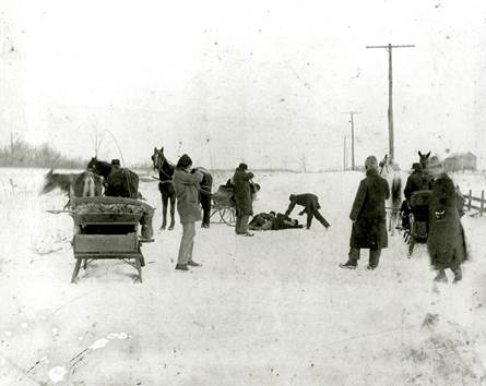 Jack and Ed Biddle lay on the ground after the police ambush, Detective Buck McGovern (left) points his rifle at them, January 31, 1902. Credit: Photo: Courtesy of the Detre Library & Archives at the Heinz History Center
