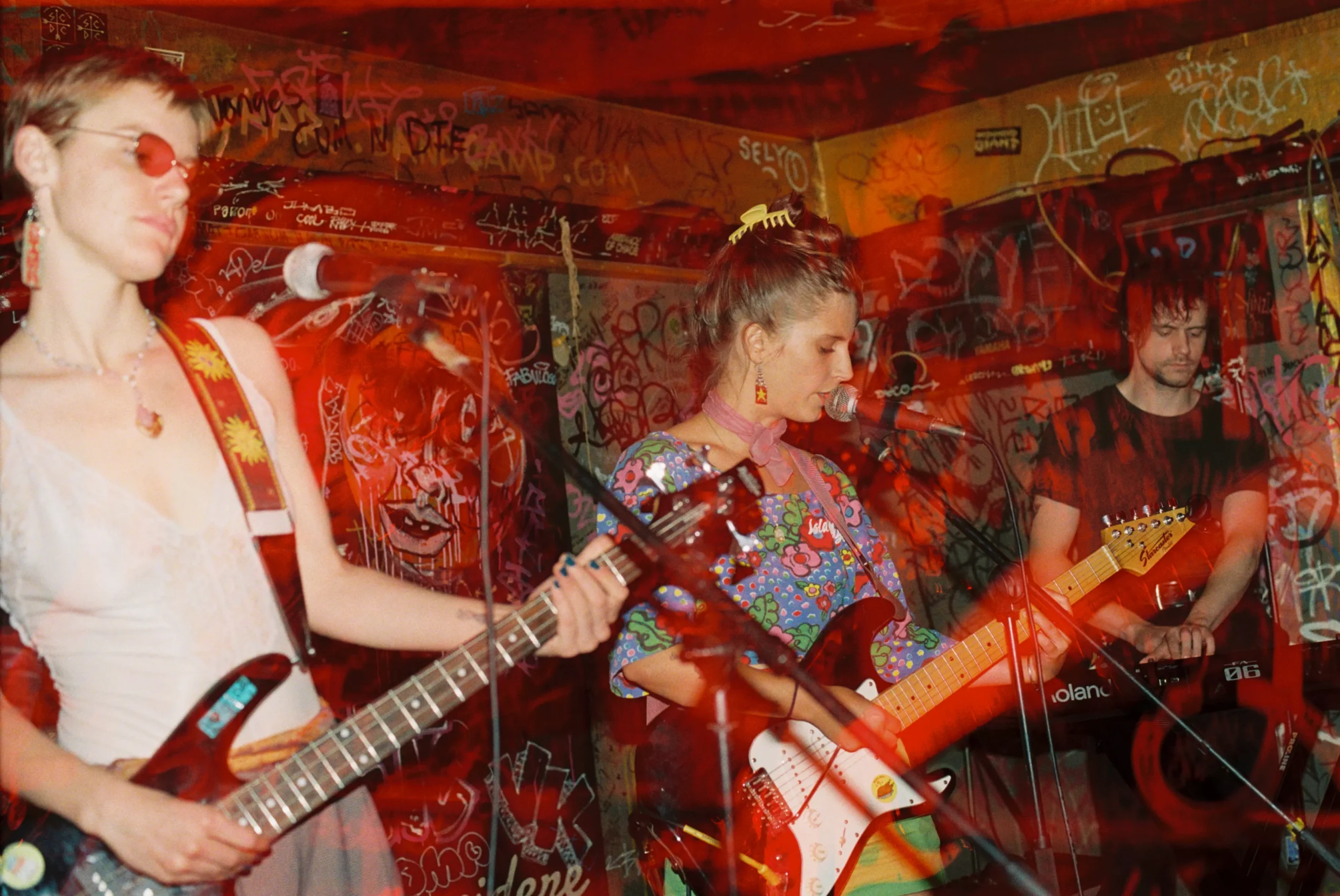 For Gina Gory, it’s a lack of dynamic variation that makes their sound so enamoring. The trio — guitarist Cloutier, bassist Connaely Martin, and synthesist Dylan Henricksen, all of whom sing and are kept in time by a drum machine — are the most established of the three groups, having been steadily releasing music since the summer of 2023. Their debut LP, October 2024’s Died Laughing, is a slow-drip of sticky, syrupy noise-pop that wearily pulses like a poisoned insect twitching its legs during its final hours.