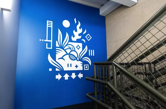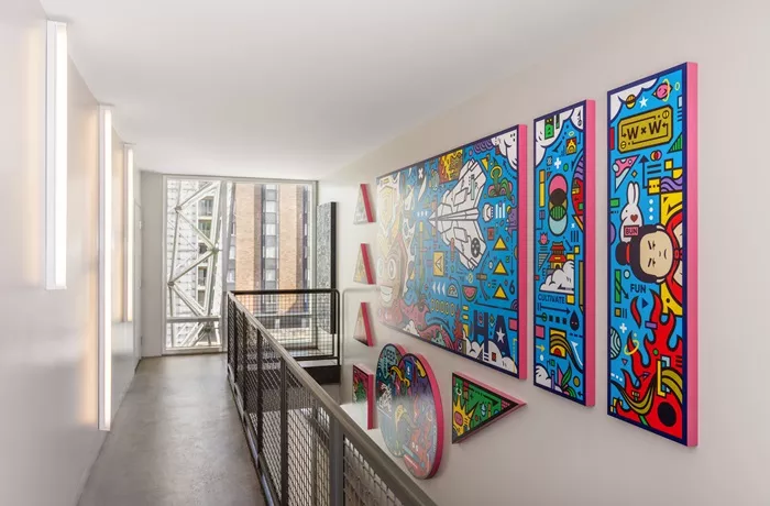 Across three floors, the vibrant works hang on walls near or in passageways such as stairwells and hallways. Each piece features scattered arrows pointing every which way. In “Dreamland (Tutorial Lvl.),” a mural between the first and second floors, arrows direct the visitors’ movement as they travel between levels.