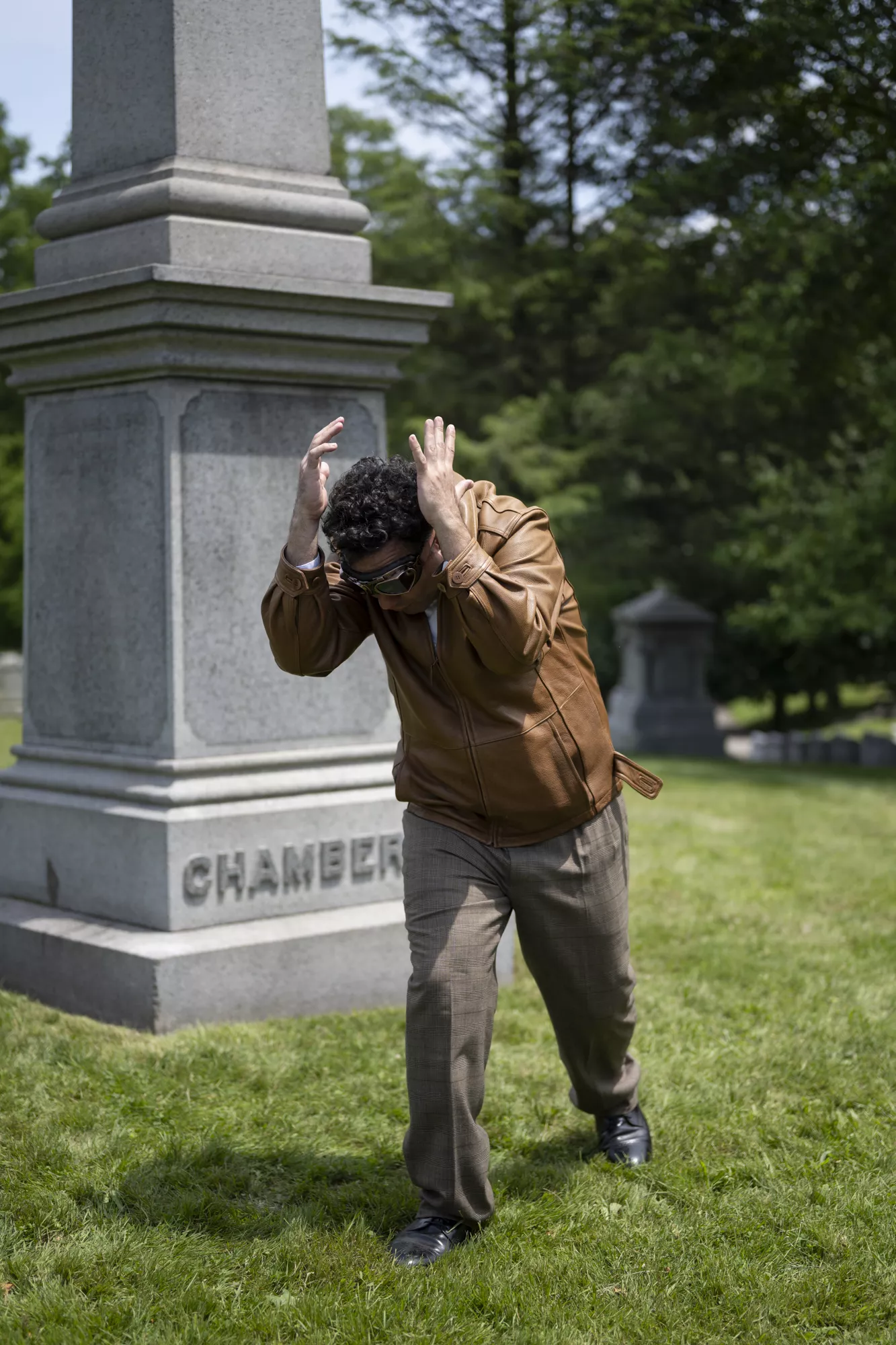 Actor Johnny Patalano waits dressed as aviation pioneer Calbraith Perry Rodgers, donning ace fighter-style goggles and a leather bomber jacket. Born in Shadyside in 1879, Rodgers became the first person to make a transcontinental flight across the United States. Despite engine explosions, crashes, and rough landings, Rodgers flew 4,000 miles and was greeted as hero by 50,000 people when he landed in Long Beach, Calif. in 1911. Tragically, he died five months later at age 33 — the first pilot to fatally crash from a bird strike — and was interred at Allegheny Cemetery.