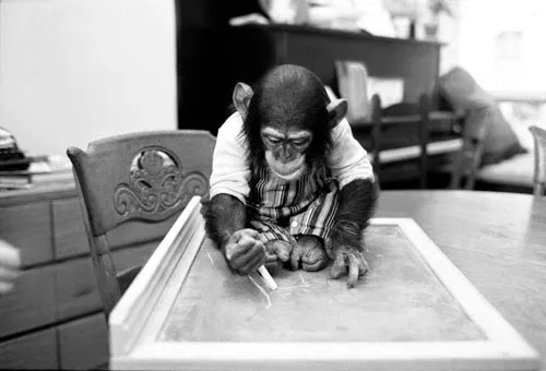When Nim grew too rambunctious, he was re-located to a Columbia-owned country estate, where his care and language training were overseen by (mostly) female students, and were the focus of frequent media attention. But increasingly, Nim and the grand language experiment both went off the rails: The chimp’s cute mischievousness turned unmanageable, and finally dangerous, while the study’s lack of structure compromised its integrity. Thus, Nim, like other child stars, fell unceremoniously from grace.
