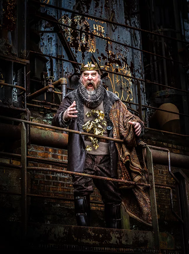 Costumes and accessories are a mix of early English garments and steelworks gear. Music and instruments pay homage to the songs of early 20th-century union workers. Lear’s fool plays the blues on a harmonica, and the Kentucky miners’ union-organizing song “Which side are you on?” is sung multiple times throughout the play.