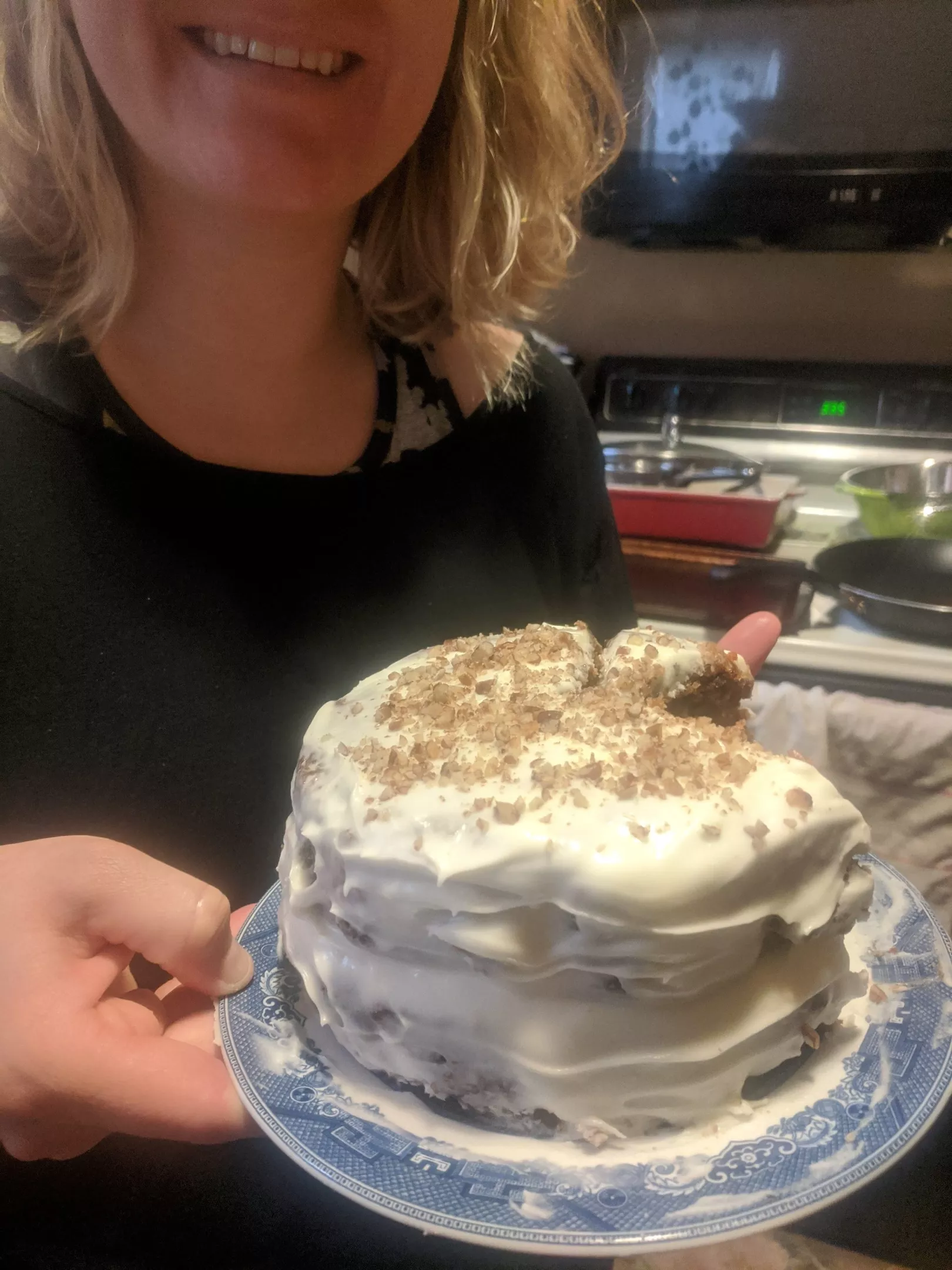 My partner Kirsten and I seem to be continually baking carrot cakes. We’re both not bakers by nature so that’s fun. A bar spoon of bourbon adds a nice complexity to the cream cheese frosting.
