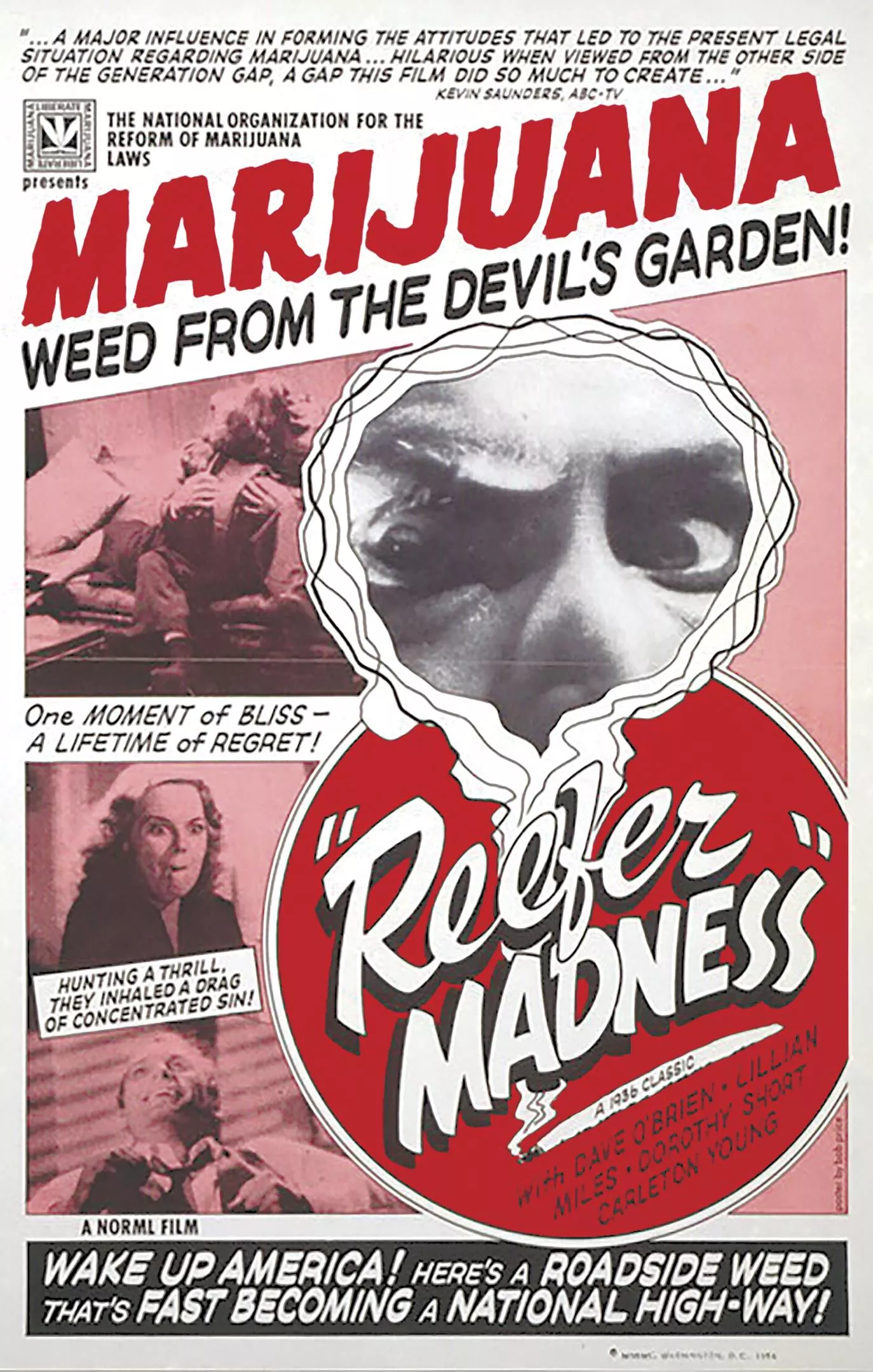 The film screened under different names across film territories in the 1930s and ‘40s — in Pennsylvania and West Virginia, it was called The Burning Question. It appears in dozens of film listings in the Pittsburgh Post-Gazette, showing at the “air-conditioned” Harris Theater in Downtown Pittsburgh, then called the Art Cinema. An illustrated P-G ad from June 1940 hypes The Burning Question — showing for 25 cents — as “Daring! Frank!” and promises “Youth Inhaling Destiny … Exhaling Lust!” Another Art Cinema ad shows Reefer Madness’ fallen heroes, lit joints hanging from their mouths, hovering over a woman lying supine. “Innocent Youth / Victims of the New Social Menace / Public Enemy No. 1” the copy read. “You Must See This Sensational Expose!”