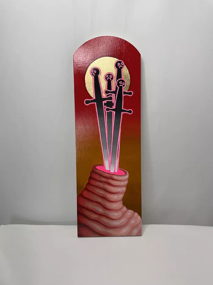 But despite the suggestive title, the show — which opens on Sat., May 1 and continues through June 30 — veers away from conveying just sunshine and rainbows. Bright colors mesh with skulls, swords, and other imagery that Sanctuary owner Susie Humphrey believes helps the exhibition stay grounded in an overwhelming sense of loss while also looking forward to the future.