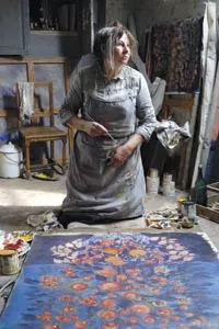 But the humbleness of her life is the flip side of a deeper passion. Kneeling in church, she pours melted candlewax into stoppered bottles. In kitchens, she scoops thick calves’ blood from basins. It’s all mixed with the white paint she foregoes rent payments to buy. And by night, beneath a home-made shrine to the Virgin Mary, she crafts — sometimes using her fingers as brushes — visionary paintings of flowers and fruit, vibrantly colorful celebrations of life no one, it seems, ever sees.