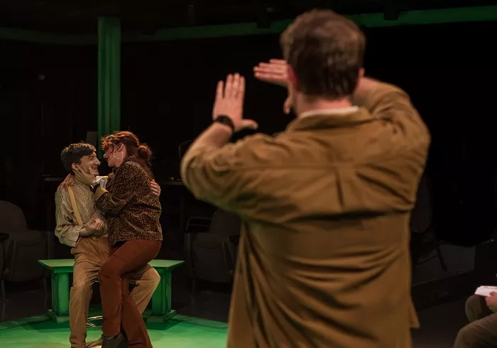 With Little Lake artistic director Patrick Cannon at the helm, the story moves fluidly through several different physical spaces with very few set pieces, deftly meeting the challenges of staging in-the-round such that there are no “bad seats.” To her credit, light designer Nicole White refuses to bow to the sentiment, common among designers, that no one looks good in green light and that it should be avoided at all costs — it wouldn’t be a faithful adaptation of the film without the shades of green she incorporates. Scenic designer Alex Lewis adds to the effect with verdurous floors, signs, and doorjambs. Costume designer Amy Hotovchin progressively leans into contrasting shades of red, helping to create the production’s vibrant tableaux.