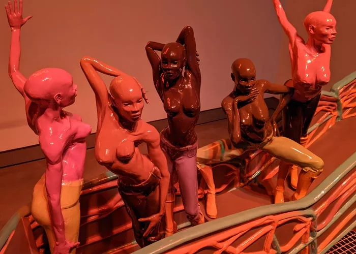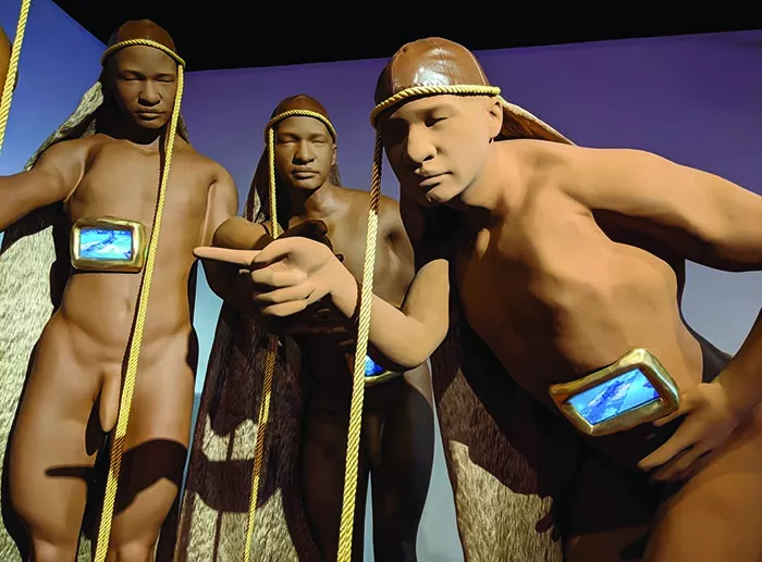 The second floor proves no less bold, as viewers are treated to multiple video installations, sometimes presented in unorthodox ways. This is the case of “Room For Doubt,” a life-sized sculpture based on 17th-century Italian artist Carravaggio’s Biblical tableau painting The Incredulity of Saint Thomas. In this case, four Black figures are perplexed by tiny screens embedded in their mid sections, all screening footage of a provocative 2009 performance by Satterwhite titled “The Robin vs The Worm.”