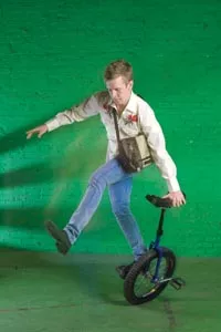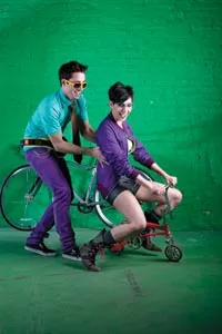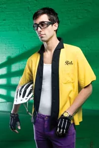 On James: Jersey leisure shirt and stretch slim slacks, both available at American Apparel. Vintage tie, available at Eons. David Yurman sterling-silver link necklace (worn as belt chain), available at Orr’s Jewelers. “Tron” sunglasses, available from ModCloth.com. Black-and-neon cycling utility belt, available from fabrichorse.com. (In background) “Langster” single-speed road WHAT? BIKE? by Specialized, available at Pro Bikes. Credit: Heather Mull