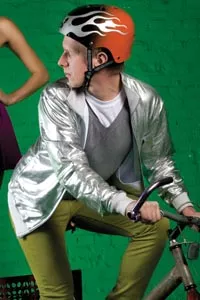 On Mike: V-neck wool sweater, silver windbreaker and stretch slim slacks, all available at American Apparel. Silver flame helmet by Nutcase, available at Biketek. Credit: Heather Mull