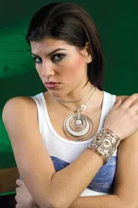 On Danielle: John Hardy “Langit Collection” sterling-silver necklace with diamond pave pendant and matching cuff, available at Orr’s Jewelers. Ribbed tank and bandeau bra top, both available at American Apparel. Credit: Heather Mull