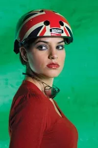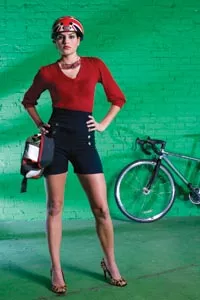 On Danielle: “Mallory Keaton” red sweater and “Pin-Up Girl” shorts, both available from ModCloth.com. Union Jack helmet by Nutcase, available at Biketek. Cycling utility belt, available from fabrichorse.com. “Arcterra” sunglasses, by Specialized Optics, and “Langster” single-speed road bike, by Specialized, available at Pro Bikes. Credit: Heather Mull