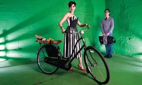 On James: Poplin shirt, wool V-neck sweater and tie, available at American Apparel. Vintage pinstripe trousers, available at Eons. “Daily Crossword” glasses, available from ModCloth.com. Laptop messenger bag, by Timbuk 2, and “Amsterdam” bicycle, both available at Pro Bikes. Credit: Heather Mull
