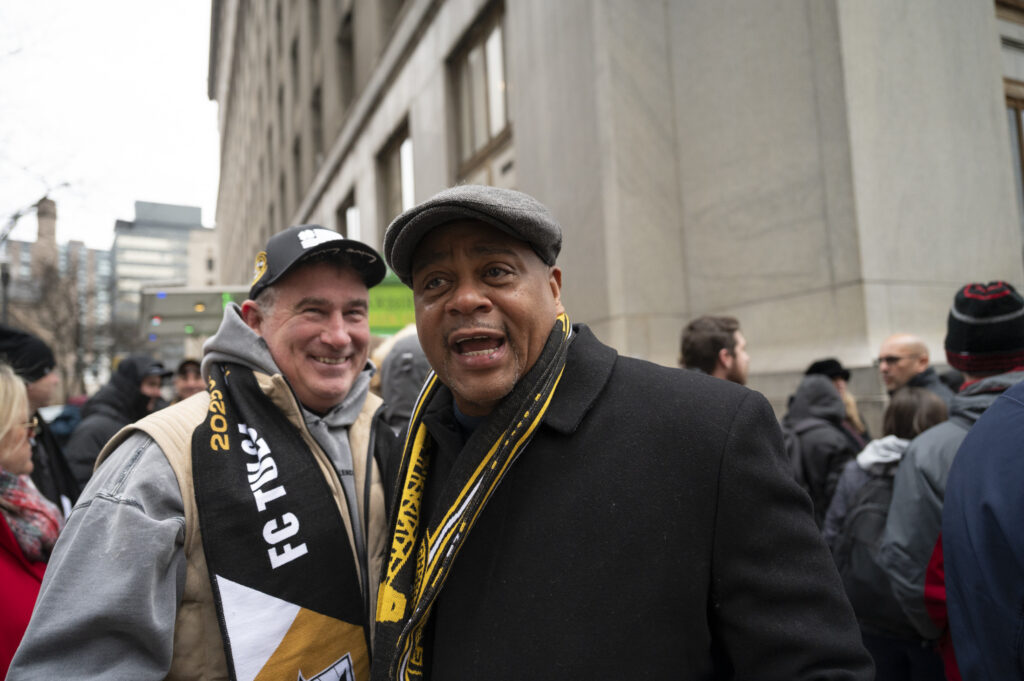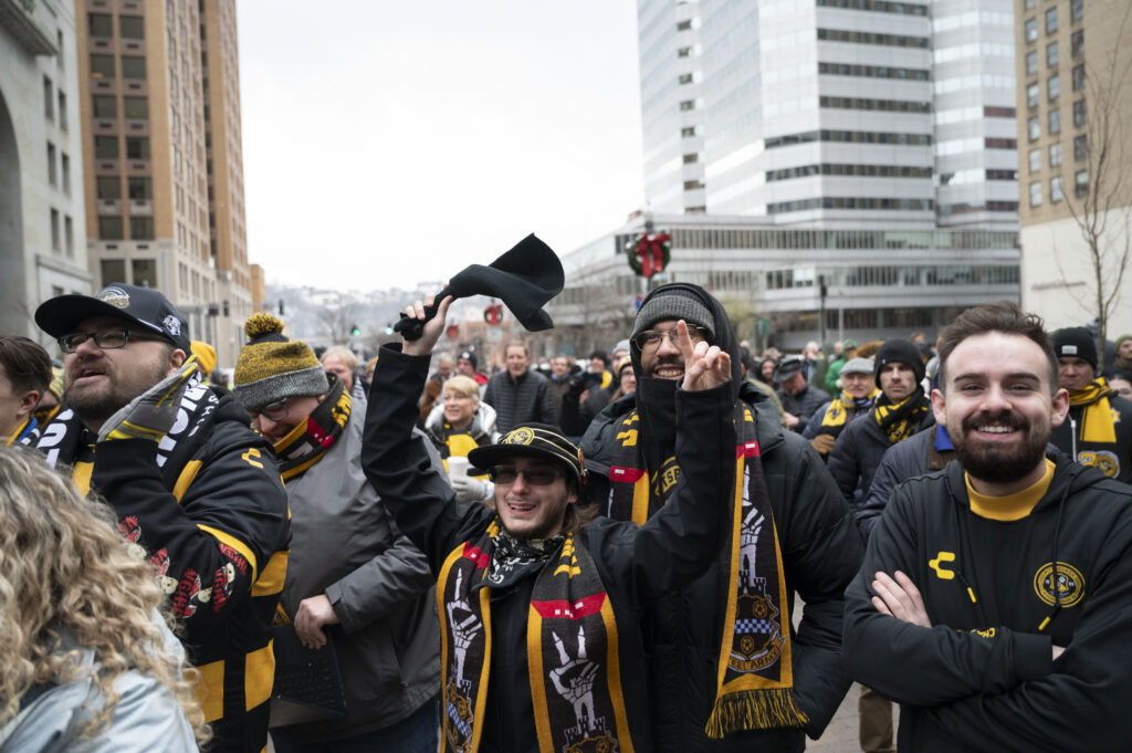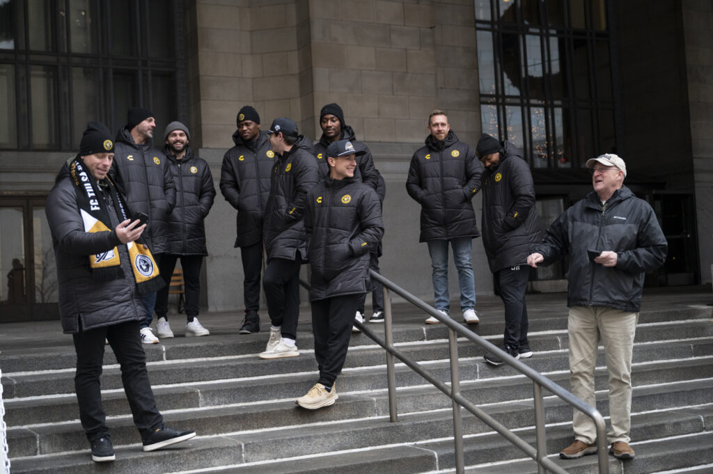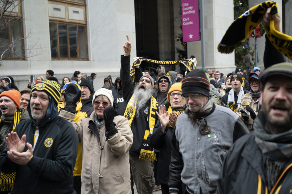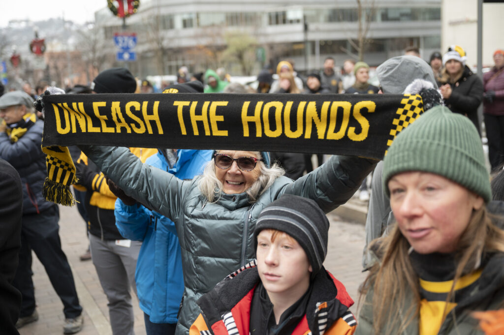 Fans of the Pittsburgh Riverhounds braved freezing temperatures this afternoon to celebrate the team’s first-ever USL championship title. Hounds’ fans, known affectionately as the “Steel Army” chanted as Head Coach Rob Vincent took the stage to give his remarks. Vincent took time to thank everyone in the crowd stating, “We as players and staff definitely need you there and we definitely hear you, particularly in the home games so it’s great you are always there to support us.” After a 25 year championship drought, the 2025 Riverhounds took home the title without allowing a single goal throughout the playoffs.