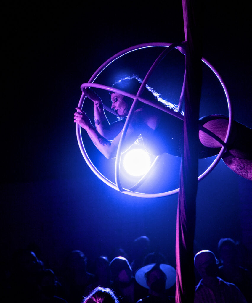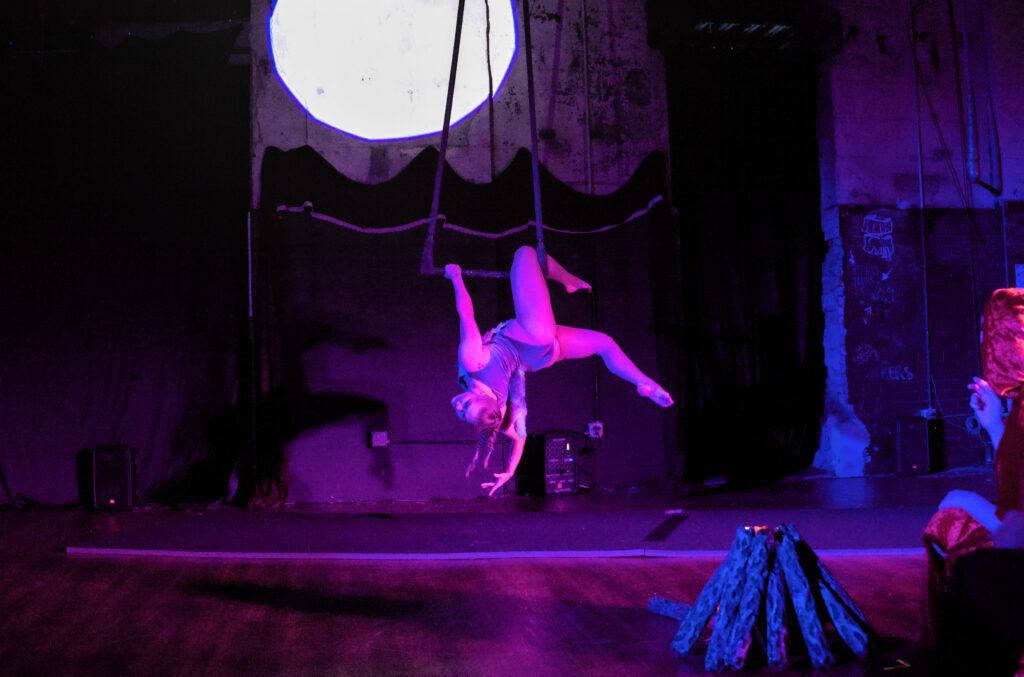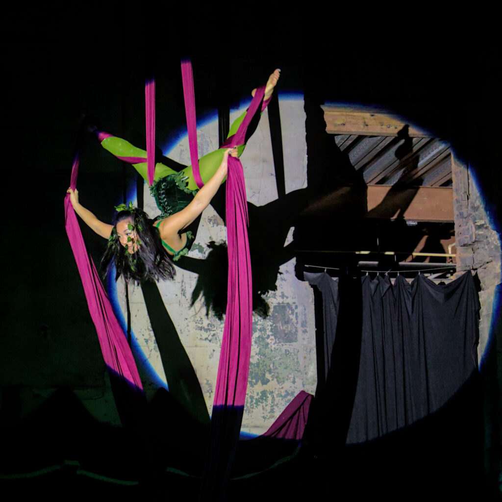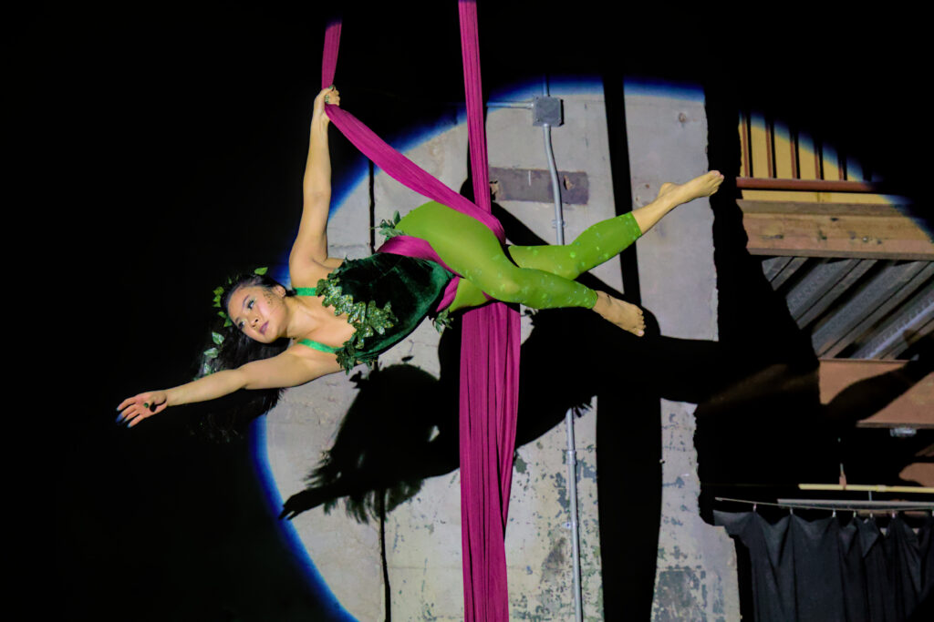 Aerialist Ivy (@circusrose_) swings on the silks. Photo by Jeff Cooper