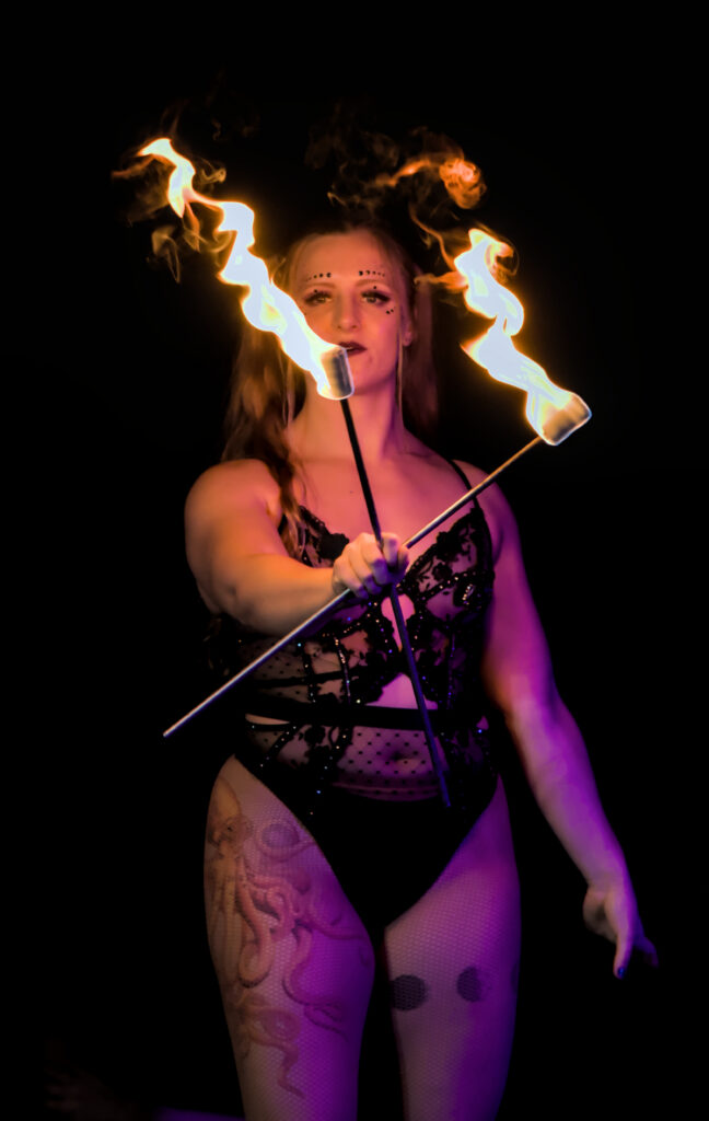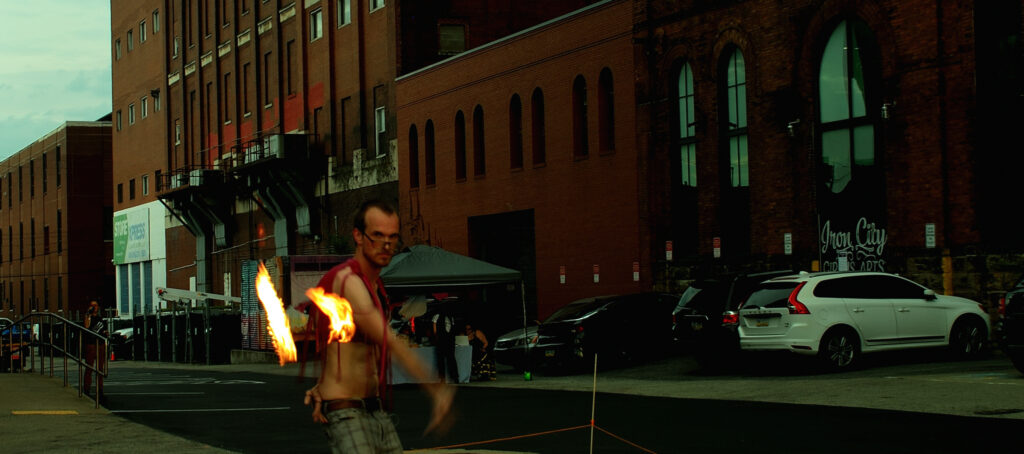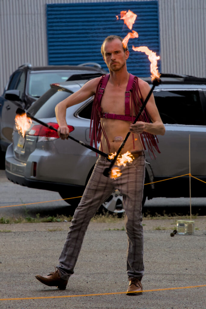 Lamp twirls fire outside Iron City Circus Arts. photo by Sage