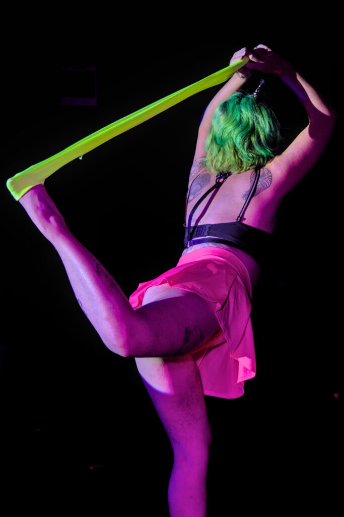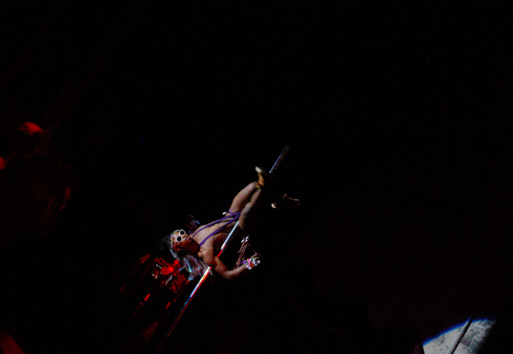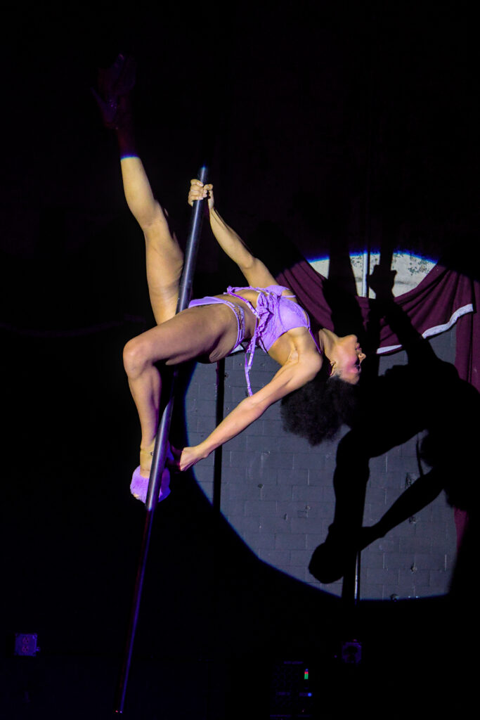 Pole artist Stacks (@stacks_da_circus_rabbit) swings on the fly pole. Photo by Jeff Cooper