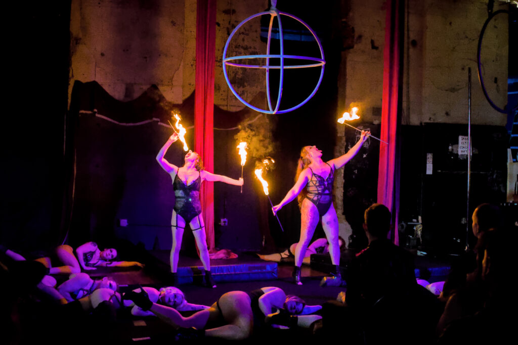 Members of Iron City Aerial swallow fire in The Coven. Photo by Jeff Cooper.