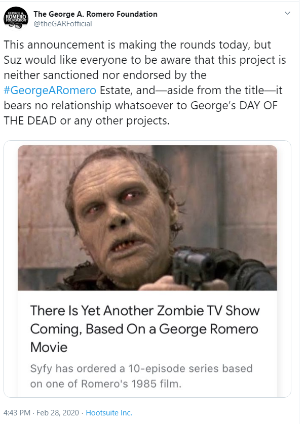 As soon as the news hit, however, Romero’s estate was quick to distance the iconic horror director’s creation from the new series. The George A. Romero Foundation, a nonprofit that has worked closely with various local institutions to preserve and advance Romero’s legacy, posted a tweet saying that Romero’s widow, Suzanne Desrocher-Romero, “would like everyone to be aware that this project is neither sanctioned nor endorsed by the #GeorgeARomero Estate, and — aside from the title— it bears no relationship whatsoever to George’s DAY OF THE DEAD or any other projects.”