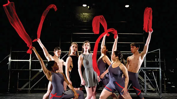 Five, choreographed by Graciani in collaboration with Point Park faculty member Kiesha Lalama, is set inside the mind of a dancer in the throes of a life-altering experience such as Graciani’s. It’s set to a mix of classical and contemporary music with live accompaniment by Pittsburgh’s Bach Choir, and performed by the university’s Conservatory Dance Company. Five’s opening act introduced the main characters, with Christian Warner as the troubled Man and Alex Hathaway as his Conscience, an unflinching jailor who forced him to face his fears. Time and again, Warner struggled to flee from his anguish, symbolized onstage by a group of dancers controlled by Hathaway. Warner also found himself at times physically bound to his situation by a long red strap that prevented his escape. (Note: Four performances of Five remain; on Feb. 12, and at the 2 p.m. performance on Feb. 13, the roles of Woman and Conscience will be danced by Hailey Turek and Skylar Schultz.)