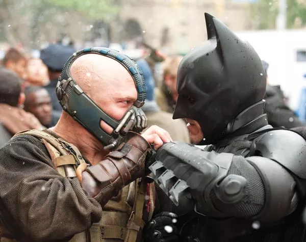 B-boy brawl: Bane (Ton Hardy) vs. Batman (Christian Bale)