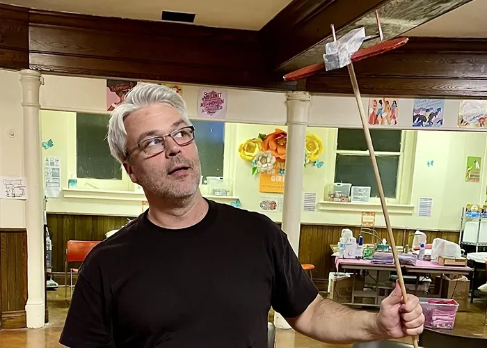 During a break in rehearsal on the lower level of the First United Methodist Church of Pittsburgh, Sensi Sellner, stage director Keturah Stickann, and performer Daniel Teadt agree that the show’s themes are profound. While the story was written for children, it also deals with isolation and loss, and The Pilot learns much from the young boy.