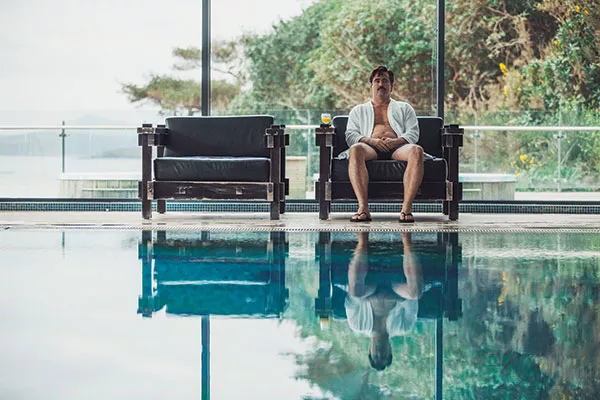 David (Colin Farrell) ponders at poolside.