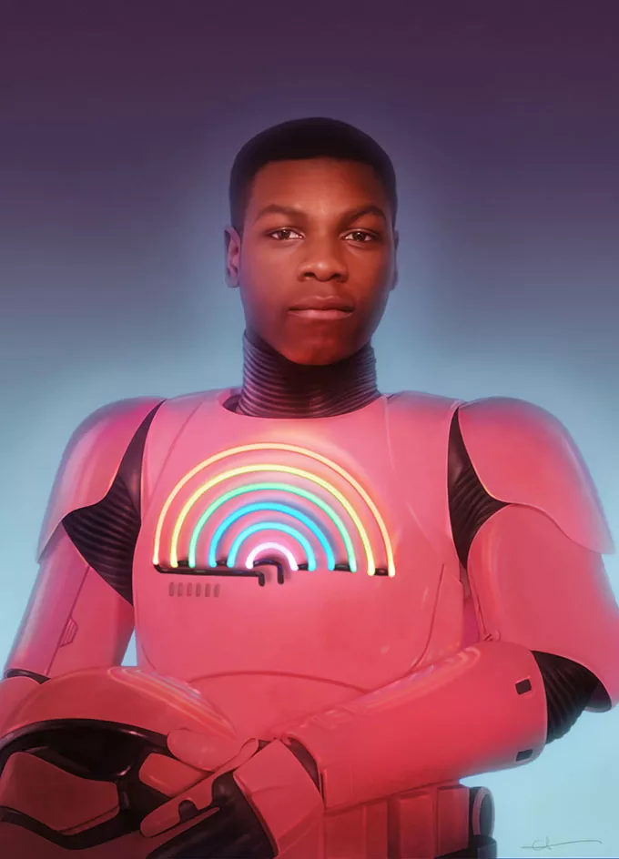 Donze’s work frequently plays on ideas and portrayals of masculinity. One of the most memorable is a portrait of John Boyega’s character Finn from The Force Awakens. He’s in his stormtrooper uniform and holding his helmet, wearing an imperceptible little smile. There’s something kind of noble about his posture, like it’s an official military portrait, though in this case, his uniform is a soft pink and there’s a neon rainbow fixed to his chest.