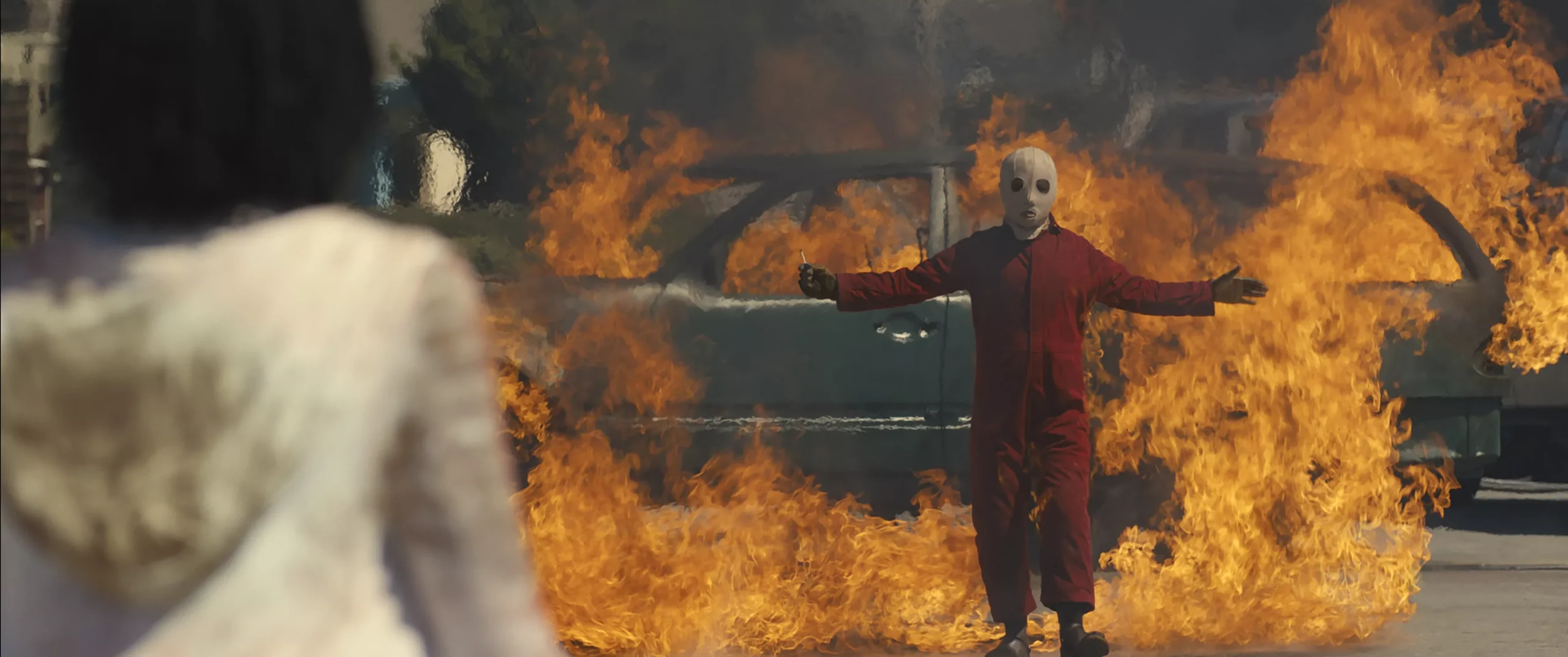 The next thing we know, it’s modern day again and we’re vacation-bound in the Wilsons’ car, jamming to Luniz’ “I Got 5 On It,” then hanging at the beach with a masterfully douchy couple played by Elisabeth Moss and Tim Heidecker (keep an eye out for the name of his boat). Adelaide isn’t a big fan of the boardwalk, and before long, they head back to the beach house, where the real horror begins: The Wilsons are stalked by four people who resemble them in every way except for their bright red coveralls, ghoulish, vacant faces, and a few accessories. Gabe’s doppelganger, if that’s what we’re calling them, has a wild beard and no glasses; Jason’s has subbed out Chewy for a gimp-style leather mask. They have scissors.