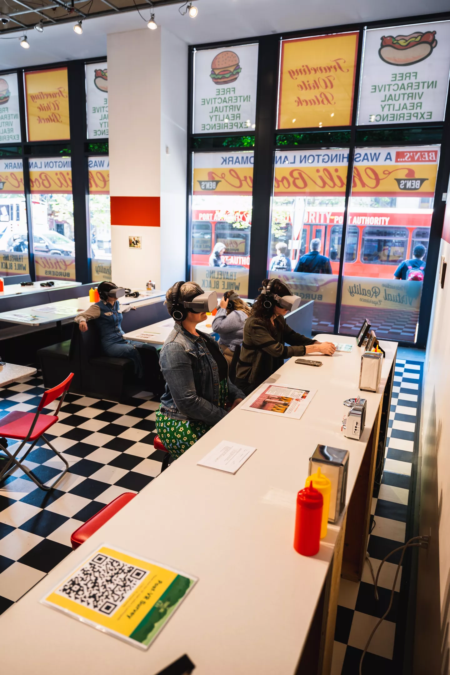 Outside, the 820 Gallery looks like any Downtown art space, its exterior currently festooned in bright, eye-catching yellows and reds that call attention to a new exhibition. Inside, however, visitors won’t find perfectly placed paintings or sculptures, but a diner setting complete with booths. Oculus GO virtual reality headsets sit waiting to, as the Pittsburgh Cultural Trust website puts it, immerse visitors in the “long history of restriction of movement” for Black Americans, and their efforts to create safe spaces.