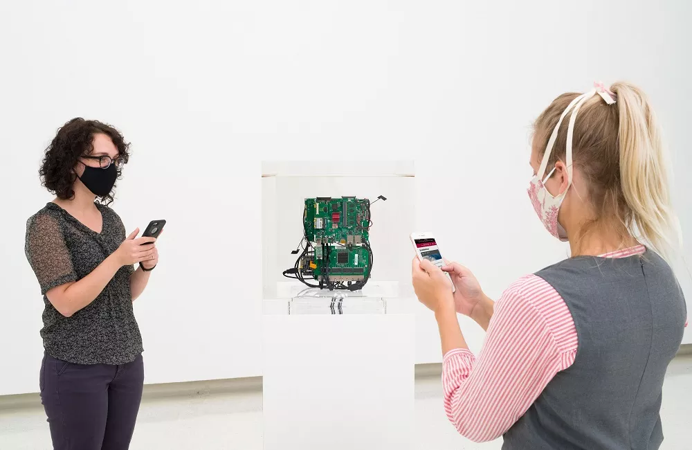 Rounding out the exhibit is “Autonomous Cube.” An indistinct clump of wires and computer paneling sits alone in Gallery 16, encased in a plexiglass cube. But those with smartphones will find an option to connect to an “Autonomous Cube” WiFi network, making the sculpture one of the few interactive works at the museum that comply with COVID-19 safety guidelines. While not much to look at, “Autonomous Cube” offers a digital safe space in the form of a Tor network, meaning the user’s online activity is blocked from ever-watchful browsers and internet sites tracking and gathering every search term and download.