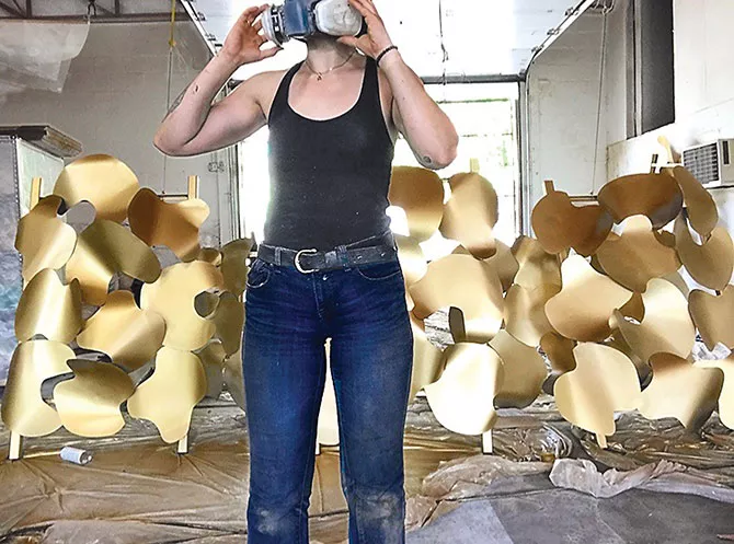 For Briggs, who has a background in architecture, making large-scale sculptures is a challenge in designing, drawing, developing, and fabricating works that honor the material from which they’re made. She’s had large-scale steel pieces at the Mattress Factory, Three Rivers Arts Festival, and Public Parks in New York, but she’s also known for her Wilkinsburg-based House of Gold project, which involved painting the outside of a house gold and then demolishing it carefully to salvage as much of the materials as possible. She also works with other metals, concrete, and stones like basalt, which she drove out to the Pacific Northwest to retrieve.