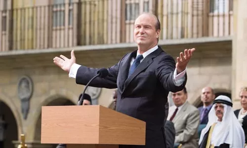 The drama all takes place in Salamanca, Spain, where President Ashton (William Hurt) is attending an international summit on the war on terror, or something similar. (Background is not this film’s specialty.) Regardless, lots of world leaders will take a single small stage for a speech and photo-op.