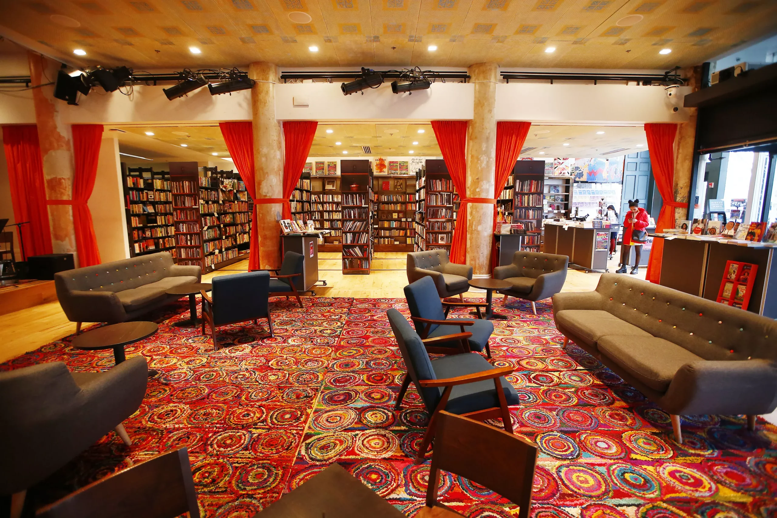 – The bookshelves are on tracks and collapse into the back of the building for events