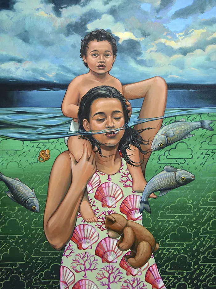 The paintings in Violence in Eden vary — some are more abstract interpretations of nature and others are literal depictions of naked women holding fruit. Several pieces in a series called “Invasive Fertility” feature anatomical drawings of pelvic bones filled with fruit, which are being scavenged by critters, like a bat munching on figs. In the more literal “Broken Waters,” a mother holds her young child on her shoulders — his head above water — as she floats under it with her kid’s teddy bear and a group of dead fish. It epitomizes the metaphorical and literal fears so many mothers have about keeping their children safe.