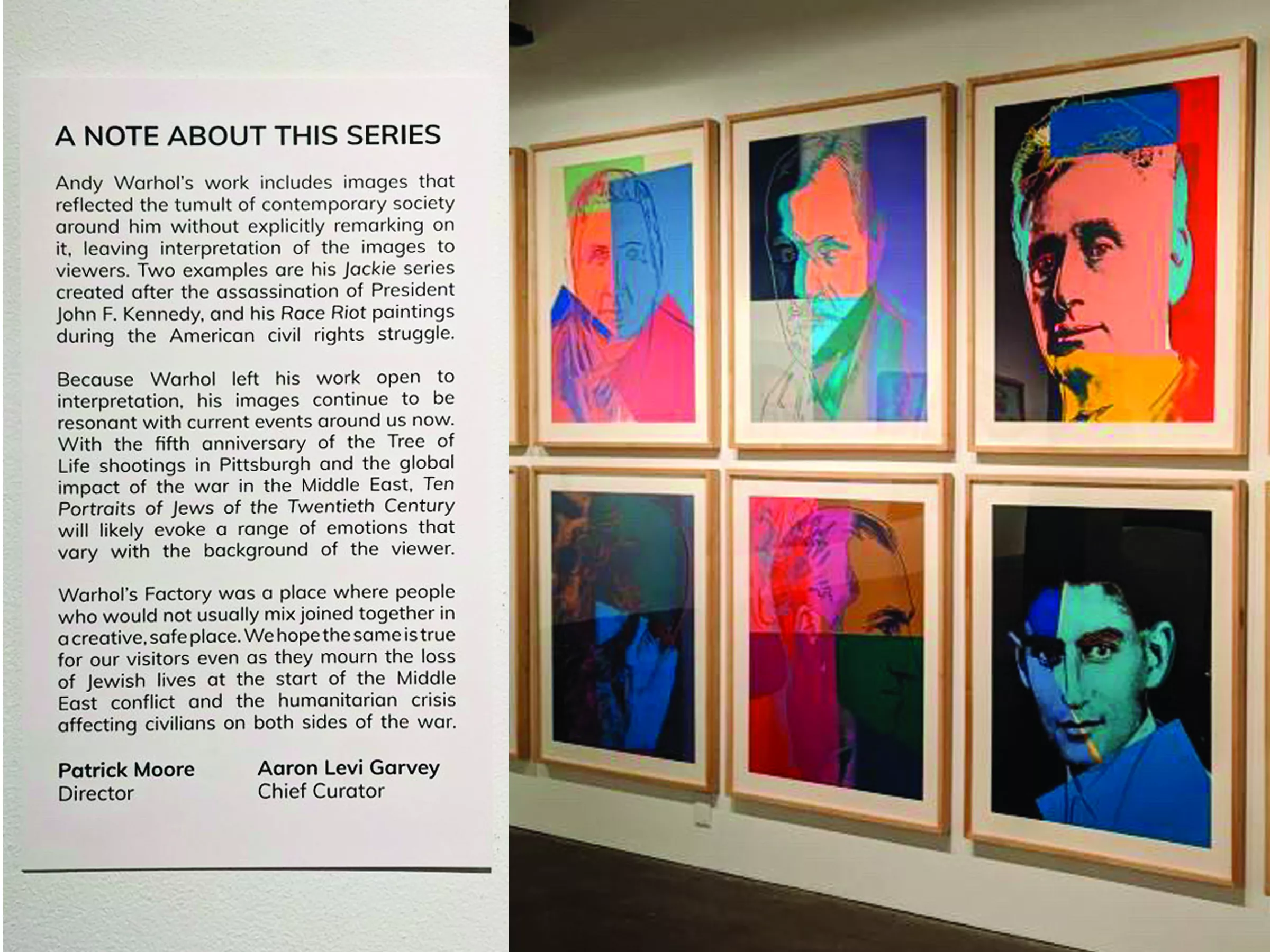 A composite image showing a museum placard with text and the colorful, screenprinted portraits it introduces.