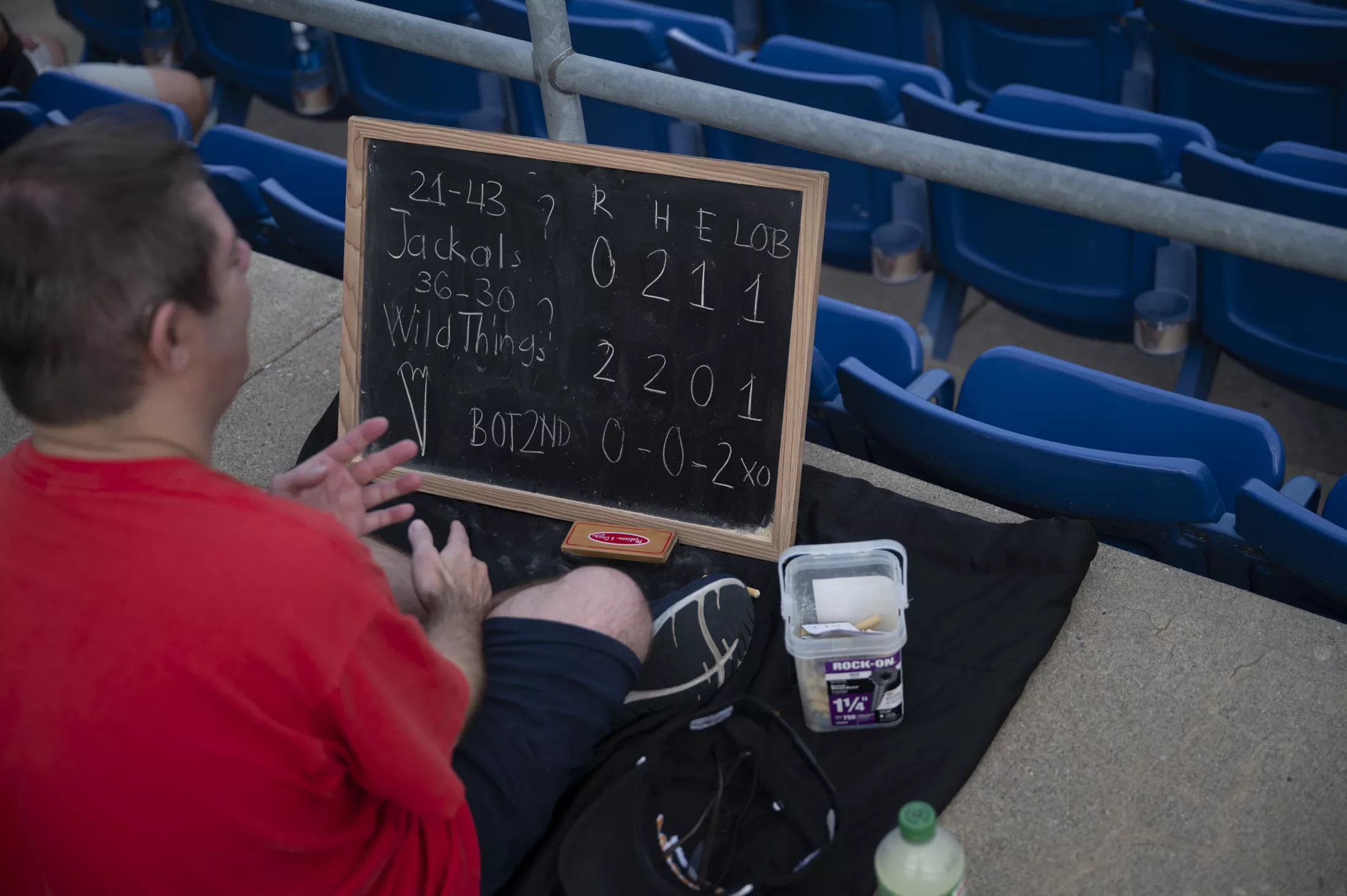 The team settles in and quiets the Jackals for the remaining innings. Fans applaud; the temperature falls. Between innings, kids crash together on the field in inflatable costumes, and the Washington Wild Thing himself takes turns mugging with fans and leading Wild Things staff, who seem to be everywhere tending to fans, in cheers as the runs pile up. Foul balls clatter in the bleachers, and fans give chase. Bugs swirl in the lights as the sky gets dark.